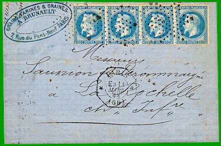 Affranchissement à 20 c. + 60 c.Cette lettre a été postée au bureau central de Paris le 11 mars 1868, plus d'une demi-heure après la dernière levée. L'expéditeur a payé 60 centimes en plus pour que sa lettre parte le jour même. Elle est arrivée à La Rochelle 12 mars.