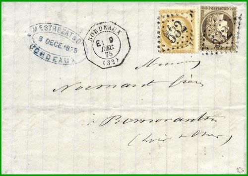 octobre 1872 pour les levées exceptionnelles Cette lettre a été postée à Bordeaux le 9 décembre 1875, après la dernière levée. L'expéditeur a payé 20 centimes en plus pour que sa lettre parte le jour même. |