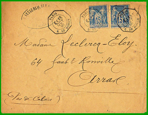 Tarif du 20 mars 1887 pour les levées exceptionnelles Cette lettre a été postée à Paris Rue de Poissy le 15 octobre 1891, après la dernière levée. L'expéditeur a payé 15 centimes en plus pour que sa lettre parte le jour même. Elle est arrivée à Arras le 16 octobre. |