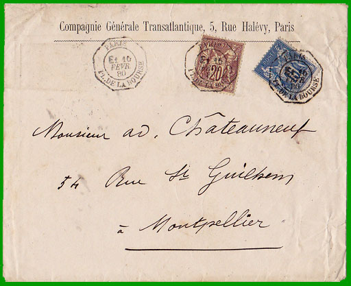 juin 1863 pour les levées exceptionnelles Cette lettre a été postée à Paris Pl. de la Bourse le 16 février 1880, après la dernière levée. L'expéditeur a payé 20 centimes en plus pour que sa lettre parte le jour même. Elle est arrivée à Montpellier le 17 février. |